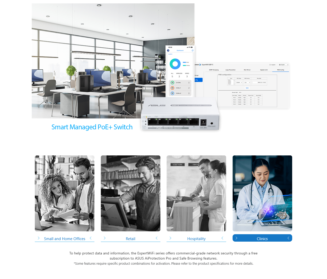 5-Port GbE smart managed PoE+ switch, 4 PoE+ ports, 60W, Supports PoE priority setting, Perfect for PoE APs, IP Cameras, VoIP Phones, Centralized app management with ExpertWiFi router