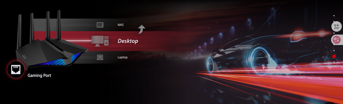 The dedicated gaming port on RT-AX82U automatically prioritizes any wired device connected to it. No complex configuration is needed, just connect your gaming PC or console to the special LAN port to give you a fast, stable connection that's always at the head of the queue.