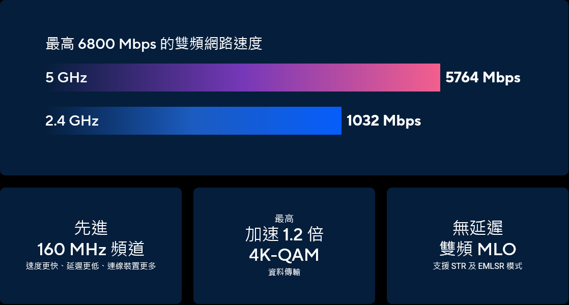 利用為追求現在與未來極致表現的人們提供的最佳效能來掌控您的網路。ASUS RT-BE86U 是舊型 RT-AX86U 的接續產品,搭載新一代 WiFi 7,可為您的連網生活提供 6800 Mbps 的超快雙頻網路速度。RT-BE86U 配備 20G 的怪物級網路總容量,並透過一個 10G WAN/LAN 連接埠和高達四個 2.5G LAN 連接埠,解鎖頂尖 10G 網路。全新的 ASUSWRT 5.0 介面支援全天候點對點網路服務,讓您安心使用網路。