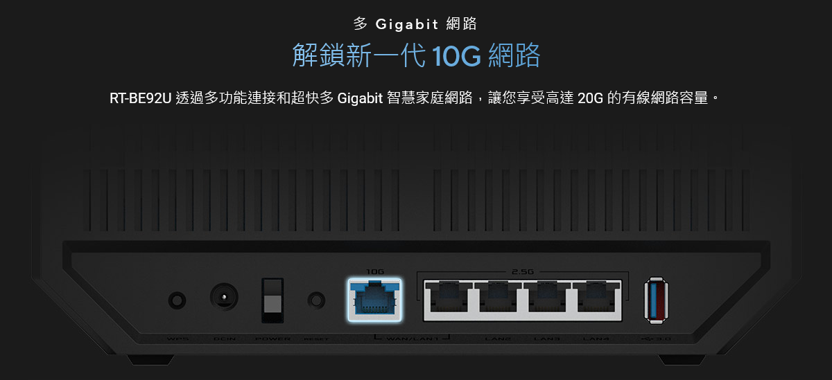 ASUS RT-BE92U 為您的智慧家庭帶來全新境界,搭載疾速三頻 WiFi 7,速度高達 9700 Mbps,並透過 ASUS RF 技術和 AI 驅動的 Smart AiMesh 技術擴展訊號範圍,同時提供高達 20G 的有線網路容量。RT-BE92U 釋放卓越的 6 GHz WiFi 效能,並採用極具未來的 10G 網路技術。憑藉全新的 ASUS Network Security 套裝和先進功能(如 IoT 網路),RT-BE92U 全天候守護您的網路安全。