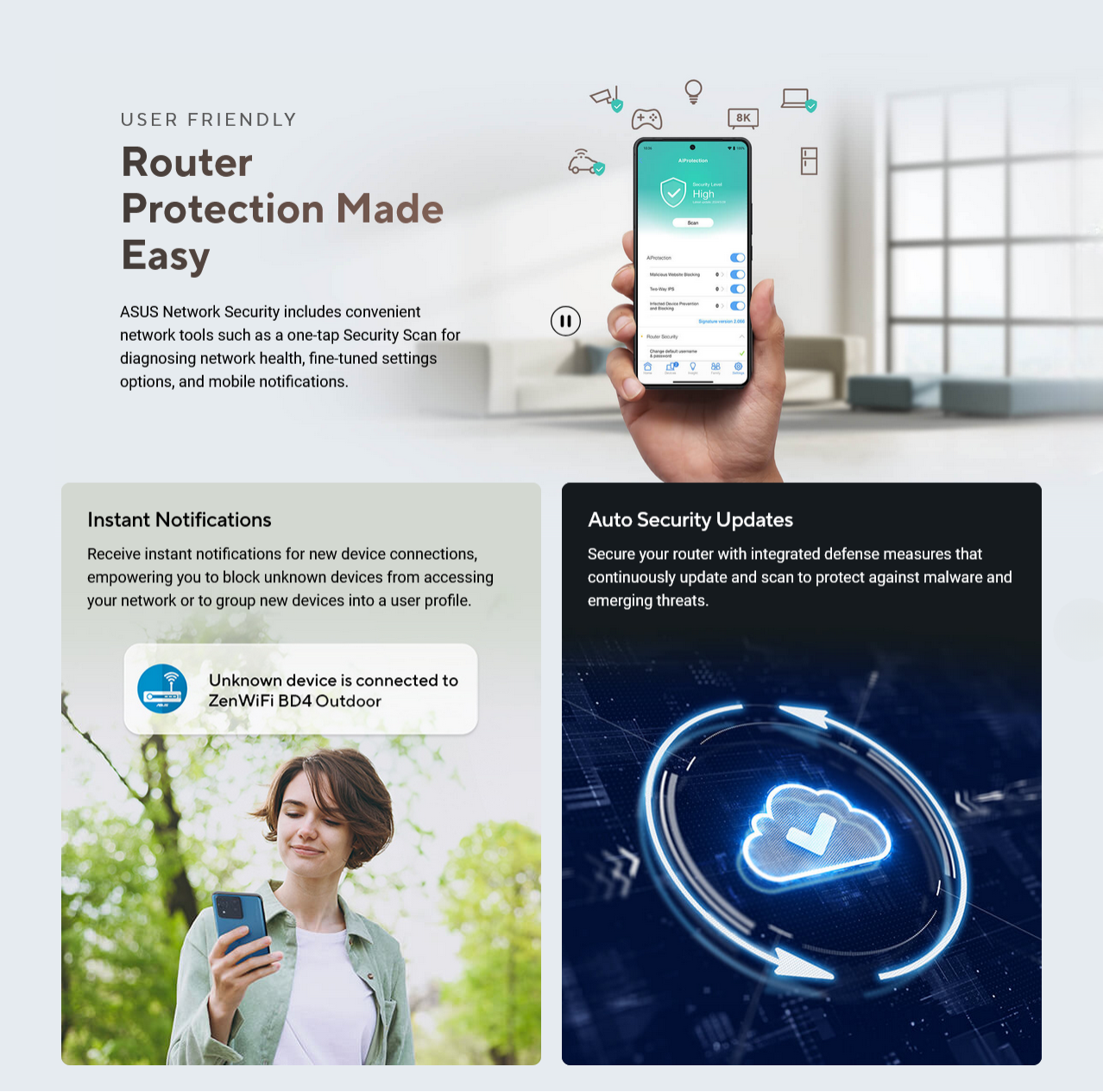 雙頻WiFi 7 (802.11be) AiMesh可擴展路由器,速度高達3600 Mbps,覆蓋範圍達2530平方英尺,雙2.5G端口,PoE供電,IP65防水等級,牆壁及柱子安裝,最多支持3個SSID用於物聯網設備,家長控制及VPN,先進的網絡安全功能。