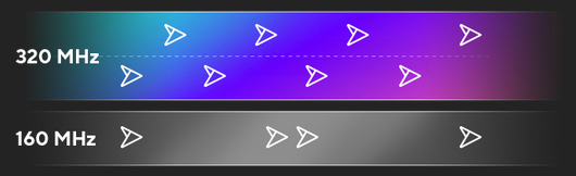 WiFi 7 在 6 GHz 頻段引入全新的超寬 320 MHz 頻道頻寬,將數據傳輸容量加倍。