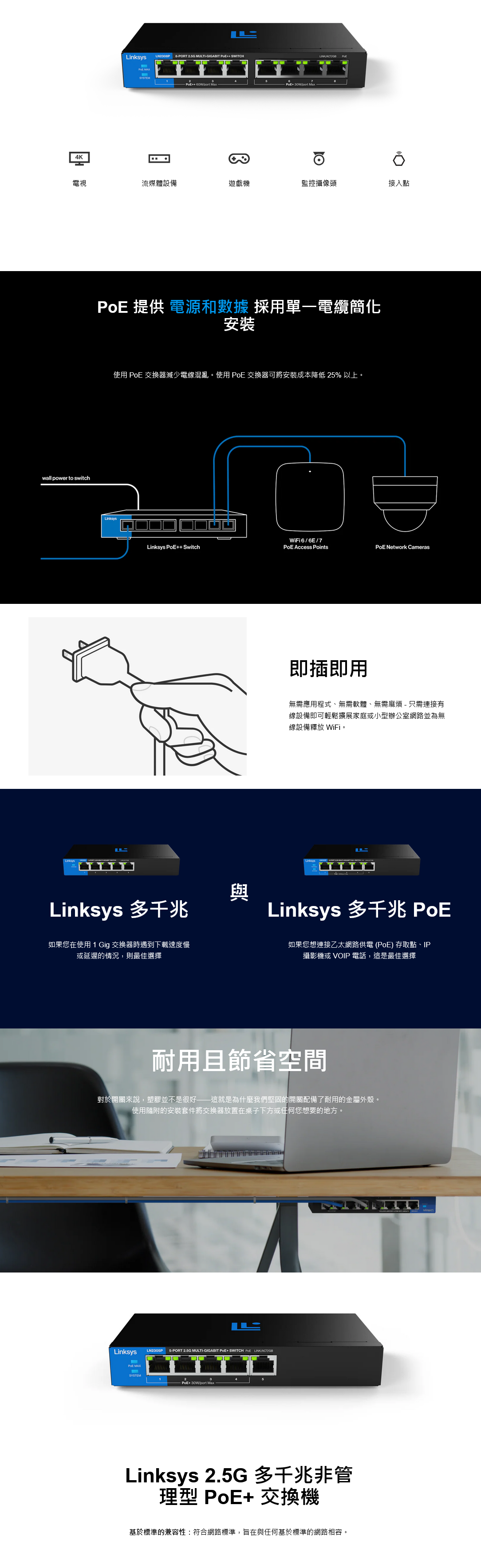 • 1x Linksys 8 埠,PoE+ 多千兆非管理型交換機