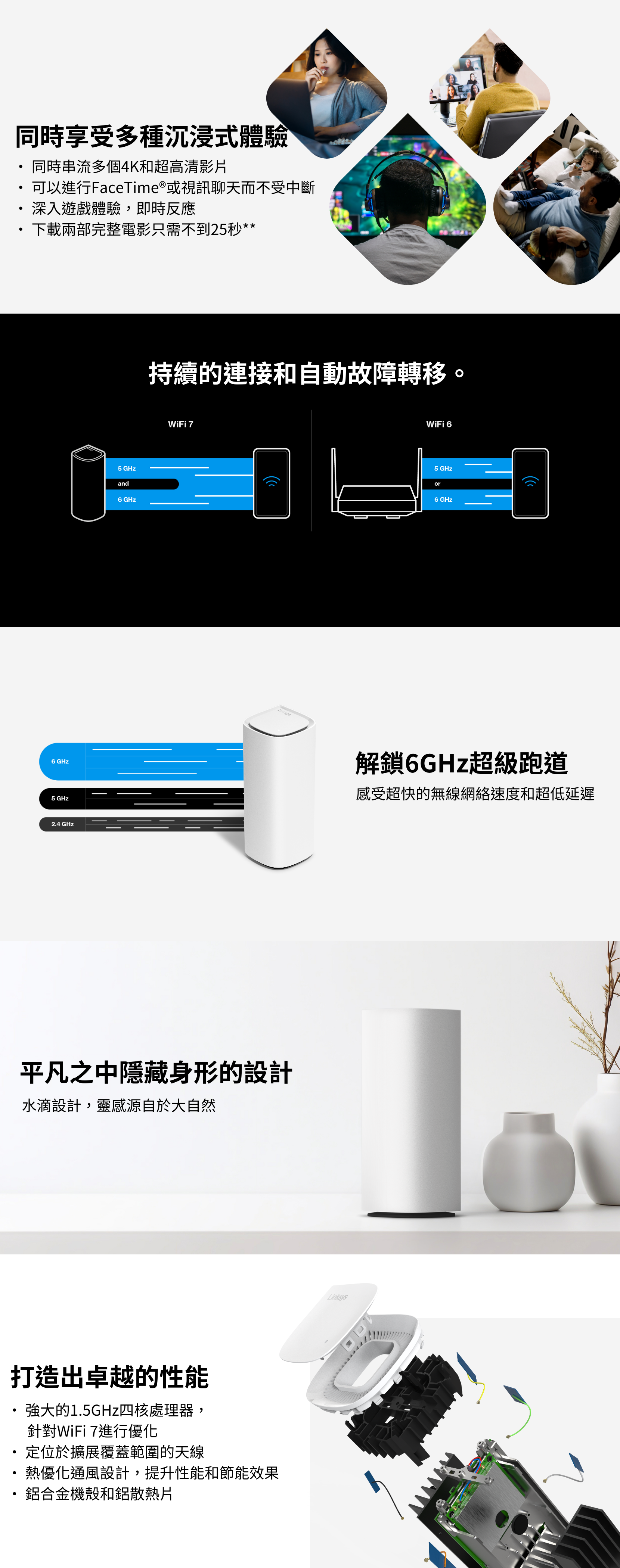 Linksys Velop® Pro 7充分利用WiFi 7的強大功能,這是迄今為止最高效的WiFi標準。速度比WiFi 6快2.4倍,並且延遲非常低,您可以在整個家中享受無瑕的串流、遊戲和連接體驗。